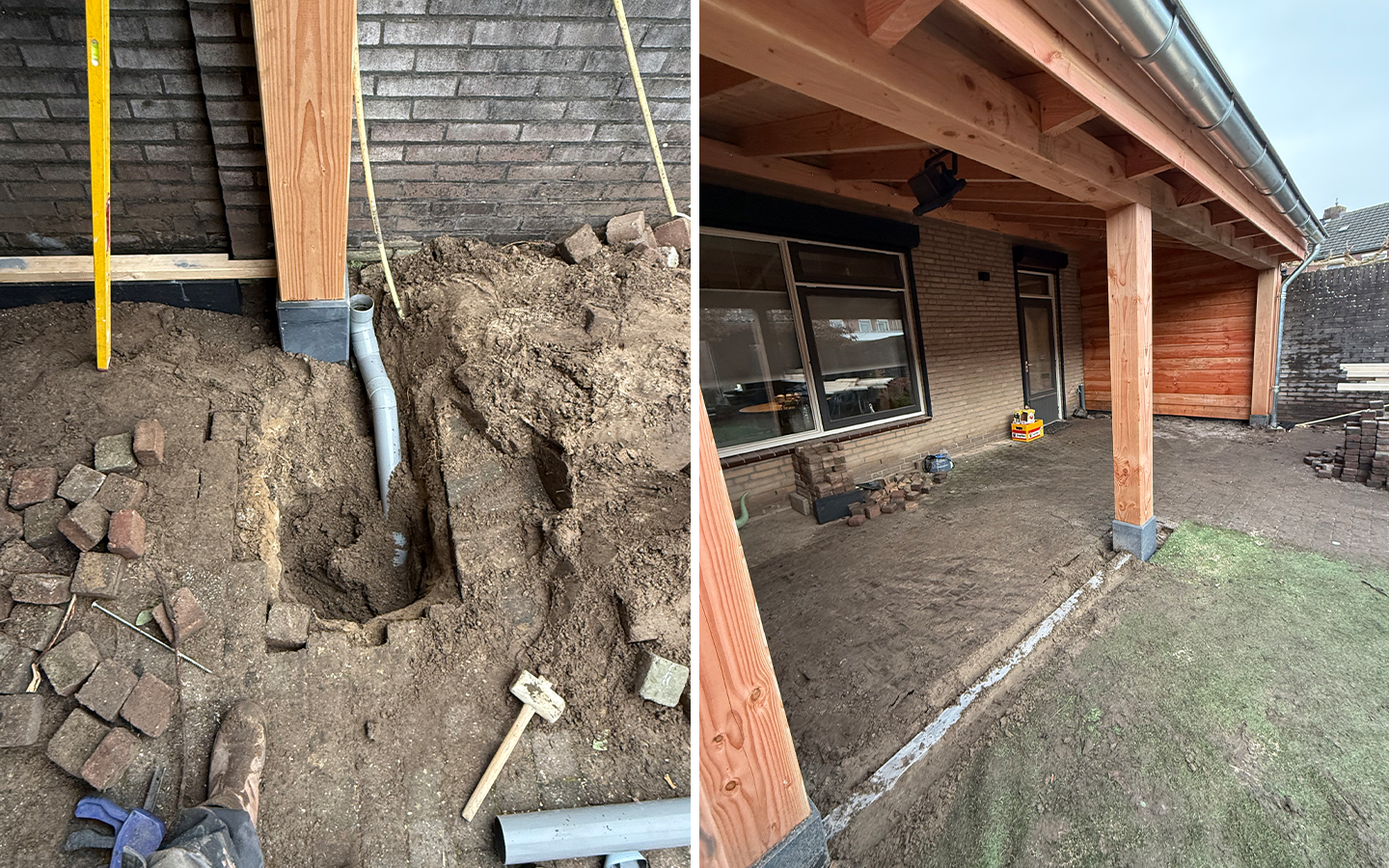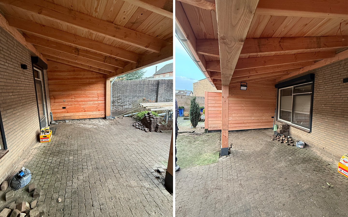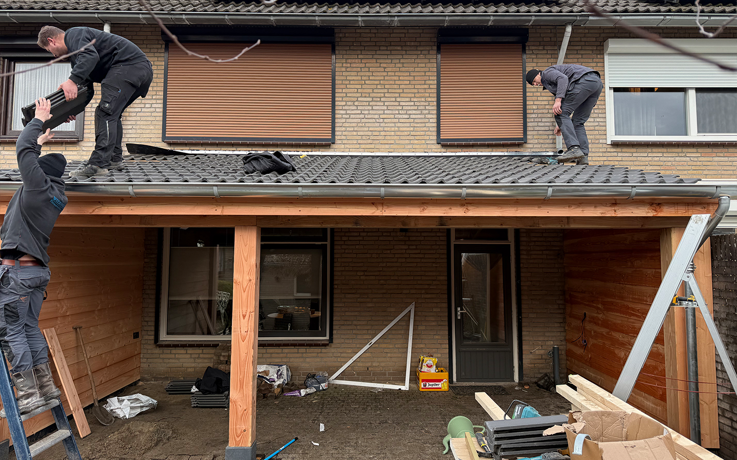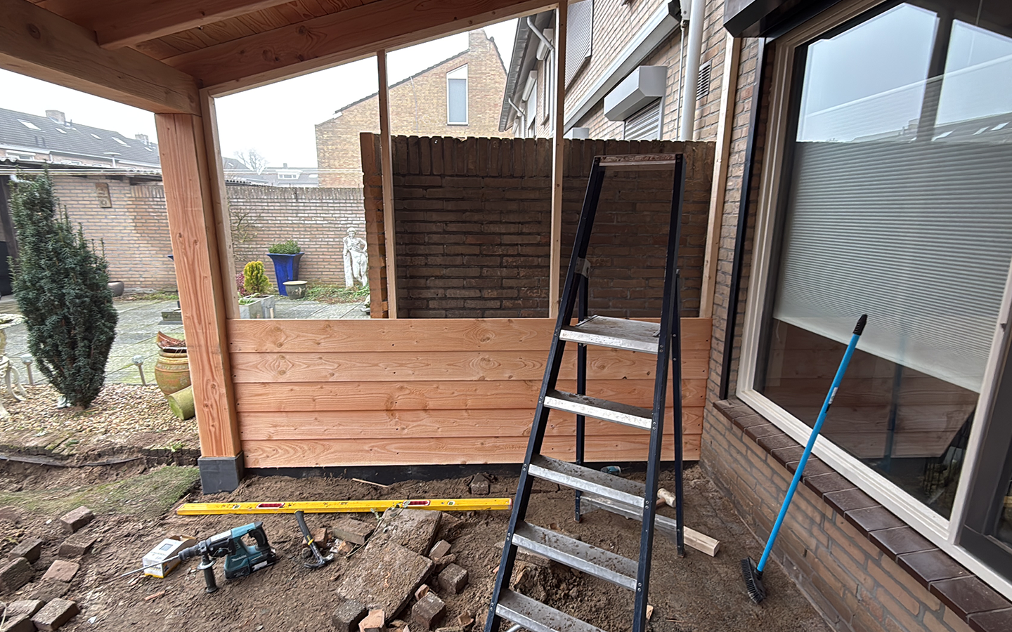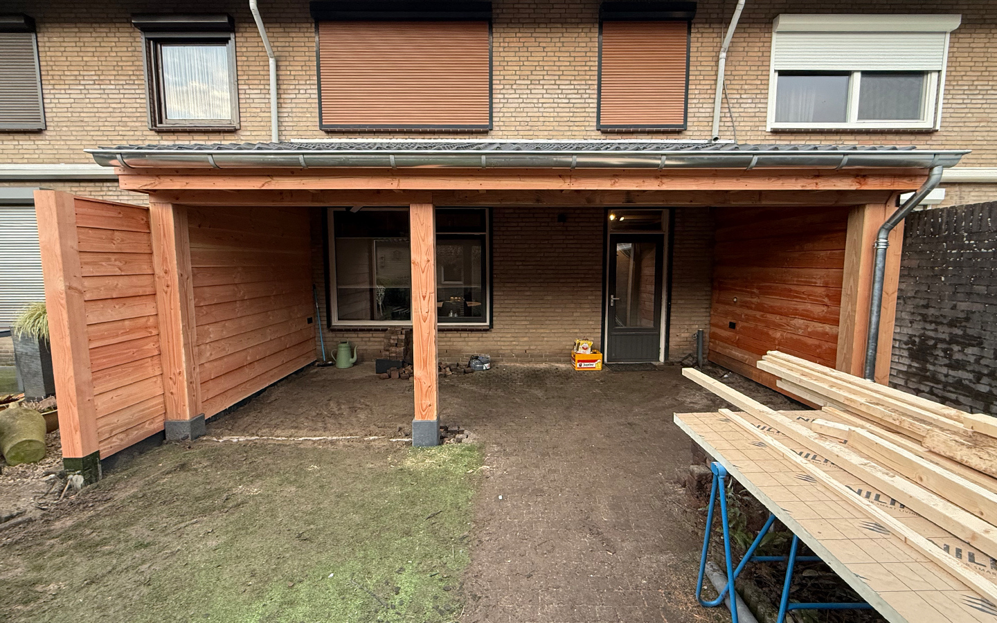 Een houten overkapping aan de woning gerealiseerd