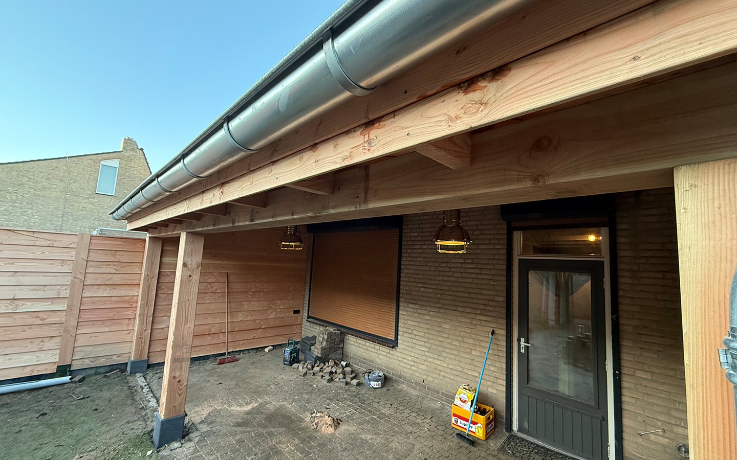 Bij de afwerking is veel aandacht besteed aan details. Zo is de regenleiding netjes weggewerkt, zodat deze niet in het zicht zit en de overkapping een rustige en verzorgde uitstraling behoudt. De houten constructie zorgt voor een warme uitstraling en maakt de overkapping tot een fijne plek om beschut buiten te zitten.