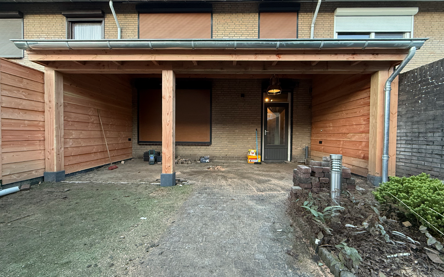 Aan deze woning hebben we een houten overkapping geplaatst die perfect aansluit op het huis, met dakpannen en een netjes weggewerkte regenafvoer.