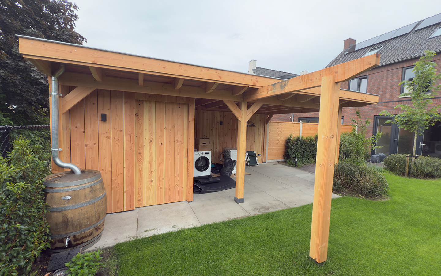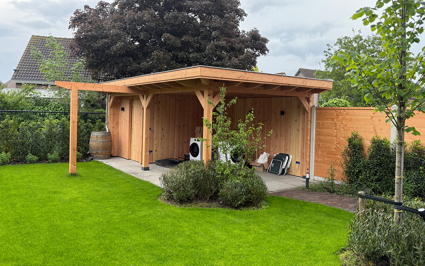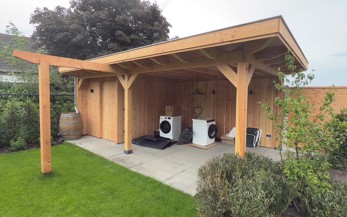 Het resultaat is een veelzijdige overkapping die zorgt voor extra opbergruimte én een fijne plek om te relaxen in de tuin.