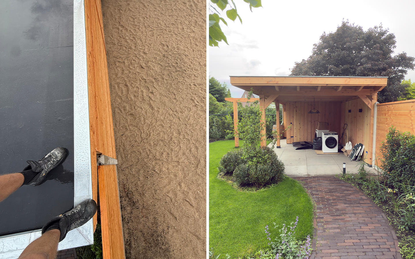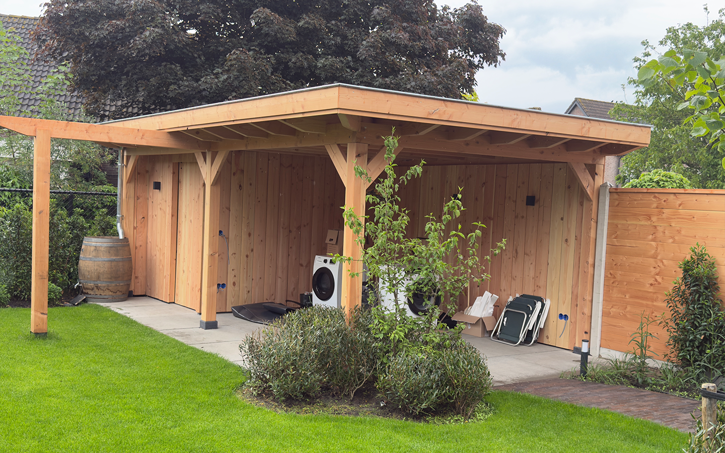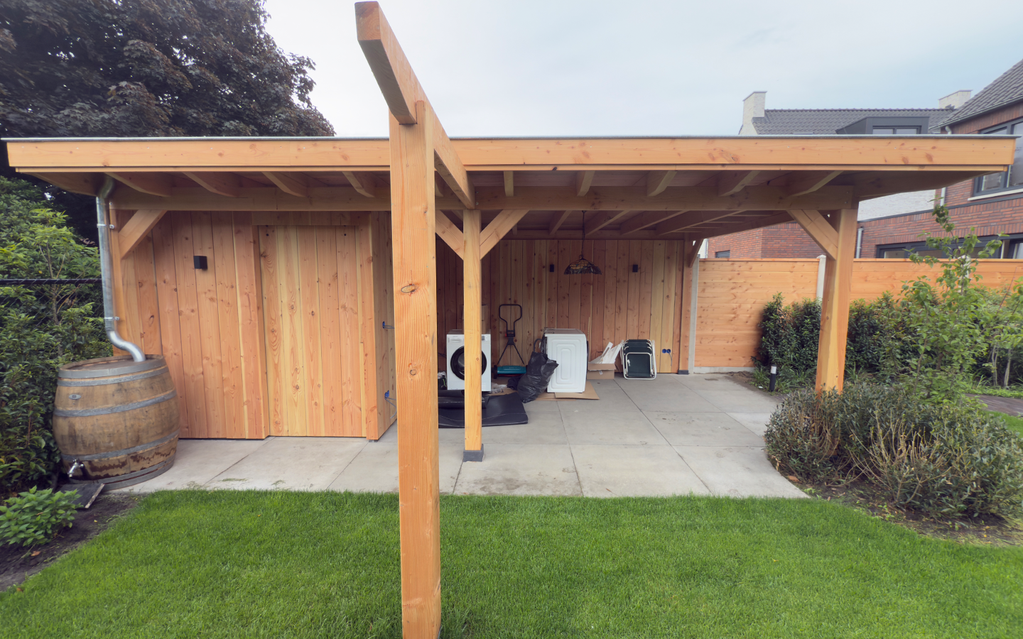 Het resultaat is een veelzijdige overkapping die zorgt voor extra opbergruimte én een fijne plek om te relaxen in de tuin.