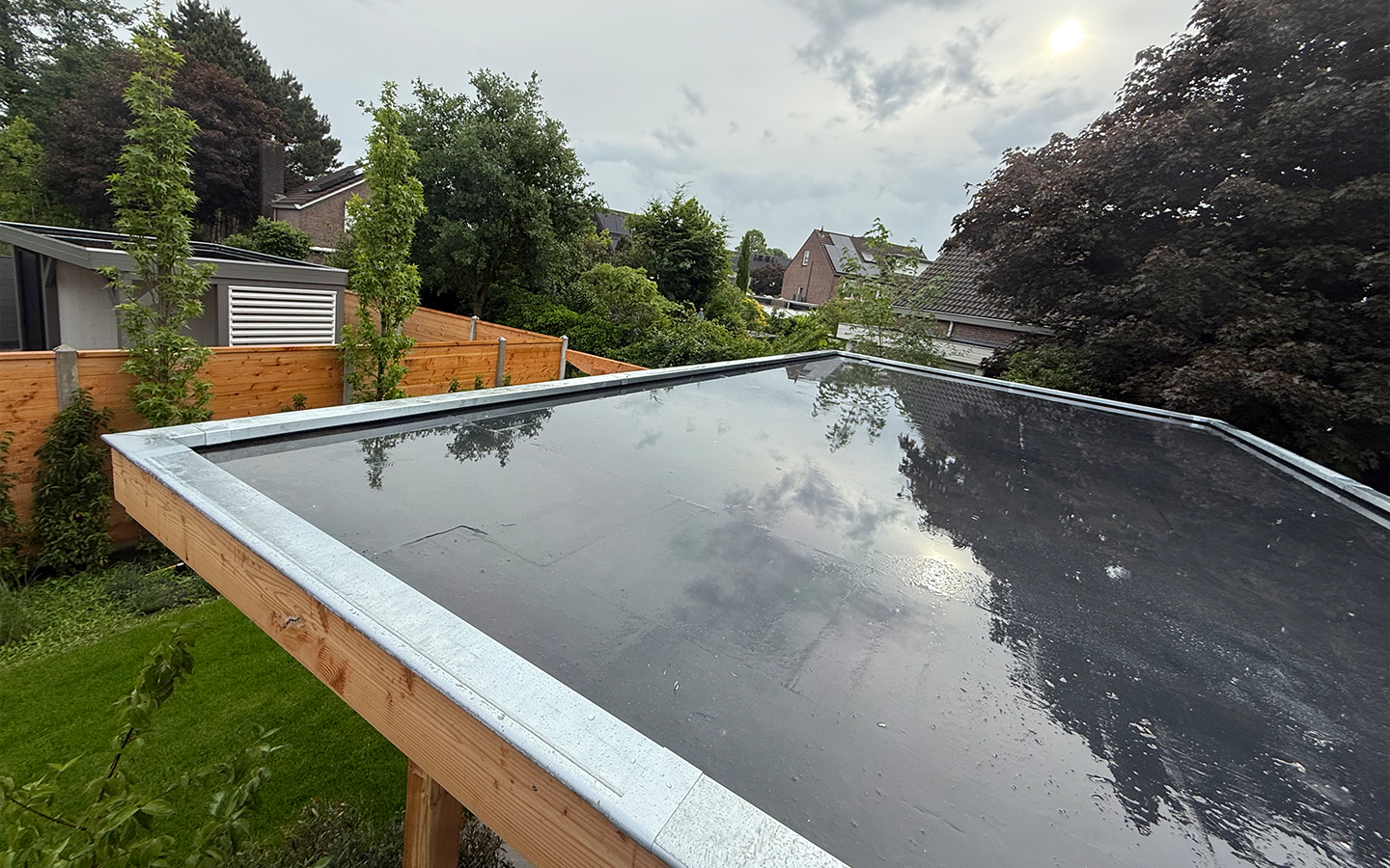 Een ruime overkapping waarin strak design en natuurlijke materialen mooi samenkomen. Wat het modern maakt is de combinatie tussen zwarte en naturel eiken planken.