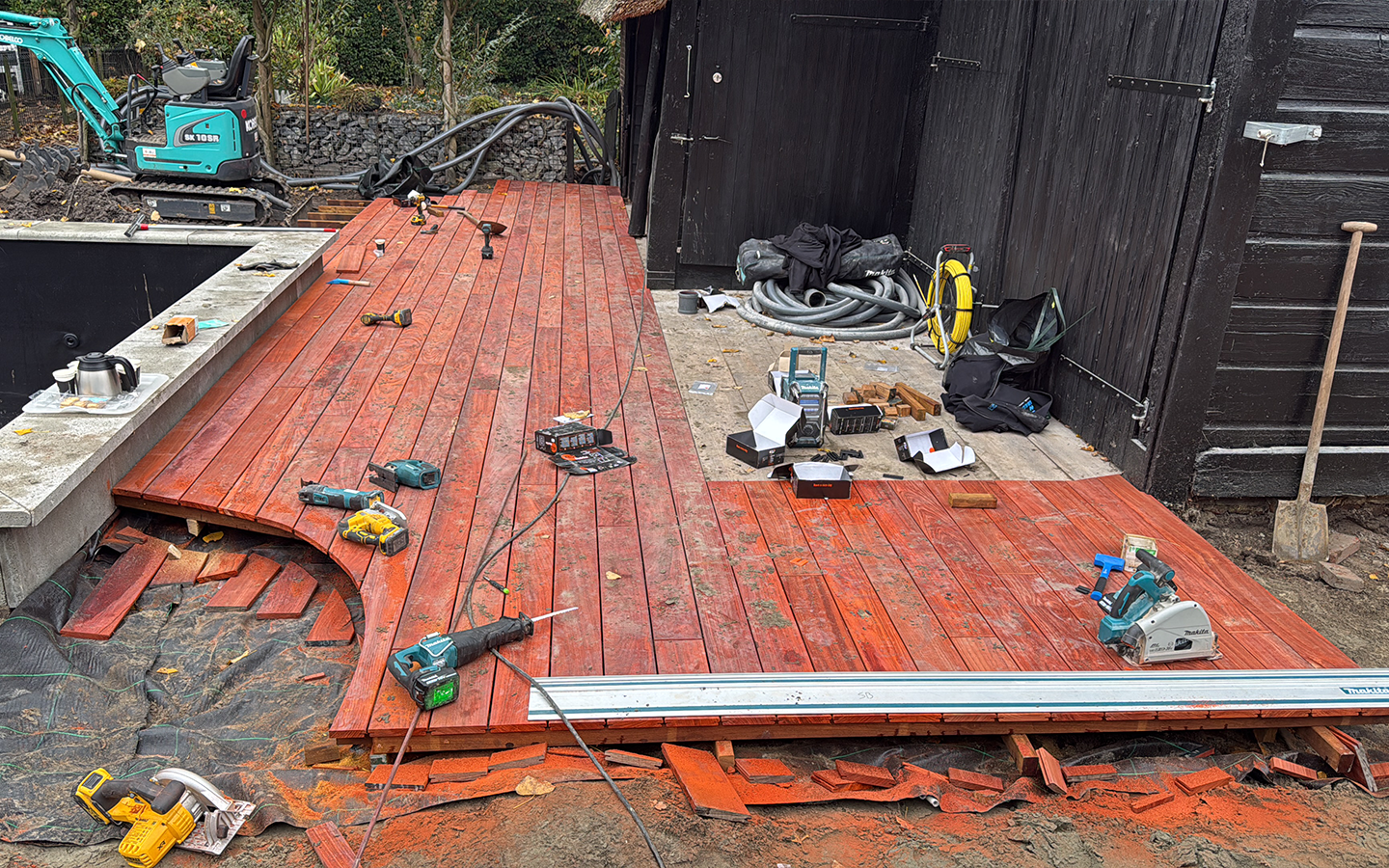 Voor dit project hebben we een houten vlonder op maat aangelegd. De vlonder vormt een duidelijke overgang tussen tuin en water en maakt de buitenruimte direct beter bruikbaar. Door te werken met hoogwaardige houten planken krijgt het geheel een warme uitstraling, terwijl de strakke lijnen zorgen voor een moderne look.