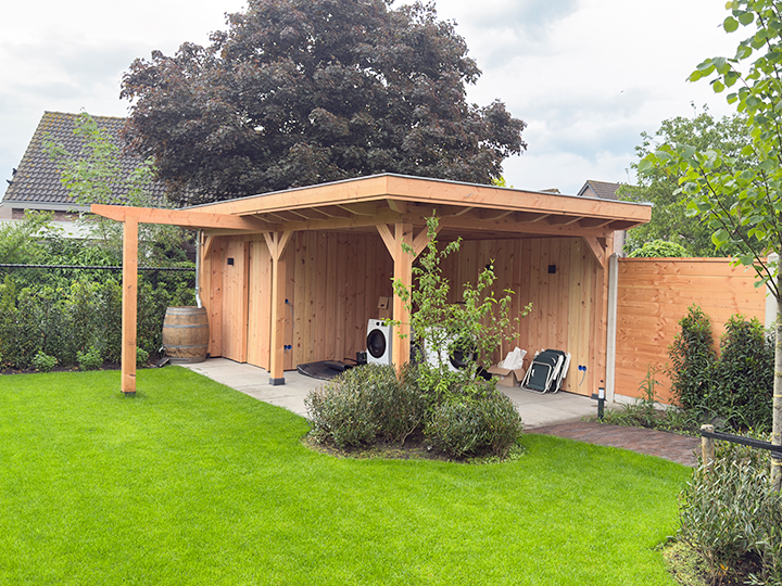 Achter in deze tuin hebben we een overkapping geplaatst met een extra opslaghok en een comfortabele plek om te ontspannen.