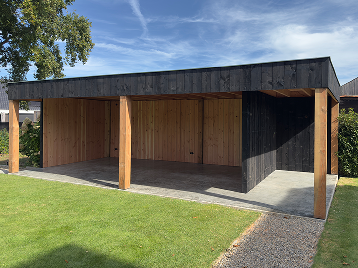 Een ruime overkapping waarin strak design en natuurlijke materialen mooi samenkomen. Wat het modern maakt is de combinatie tussen zwarte en naturel eiken planken.